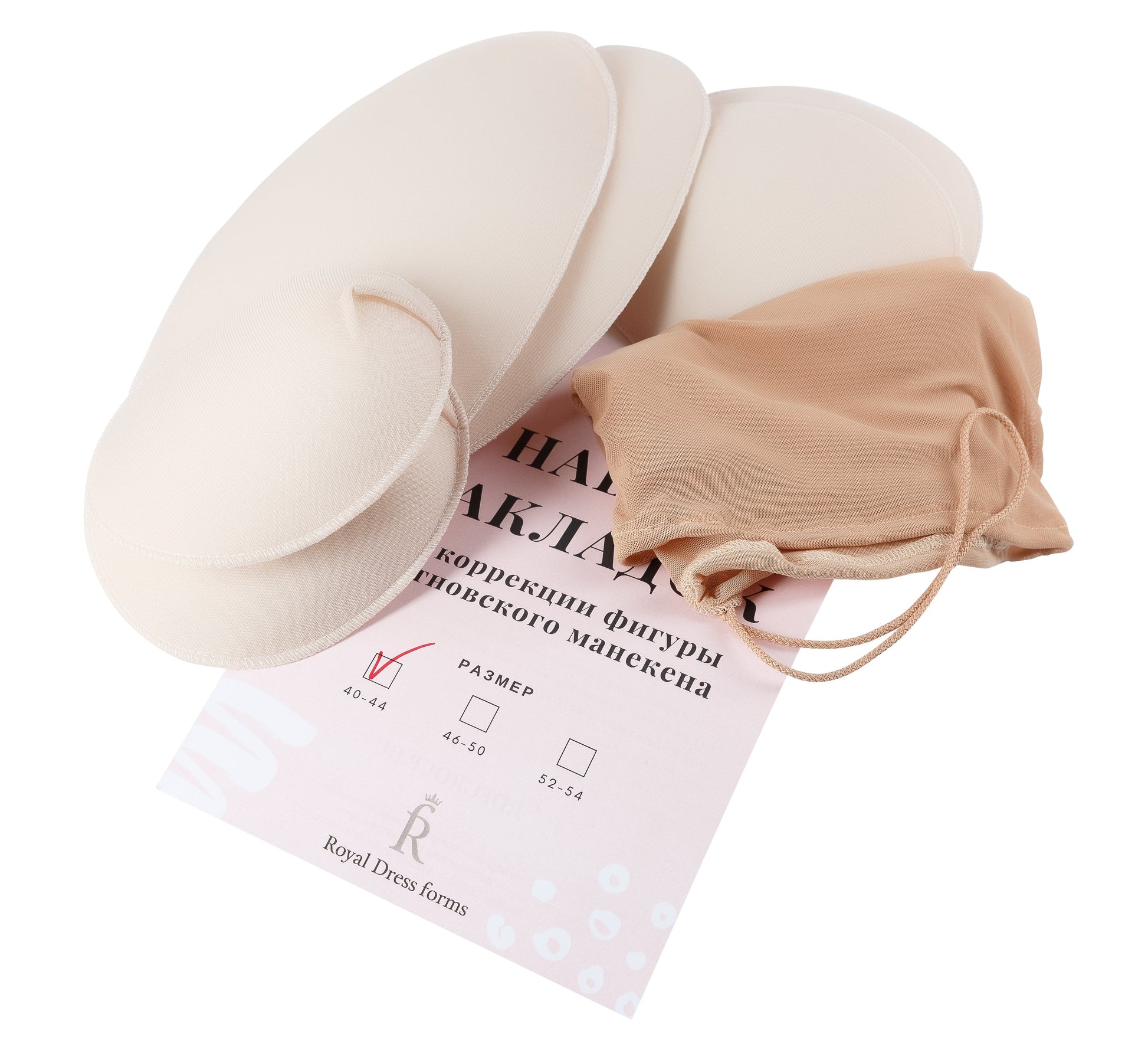 12 paddings of beige color + beige translucent elastic cover for fixation (suits for dress form of light color).
